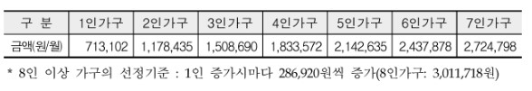 1인 가구 기준 207만7,892원(23년) -> 222만 8,445원(24년)