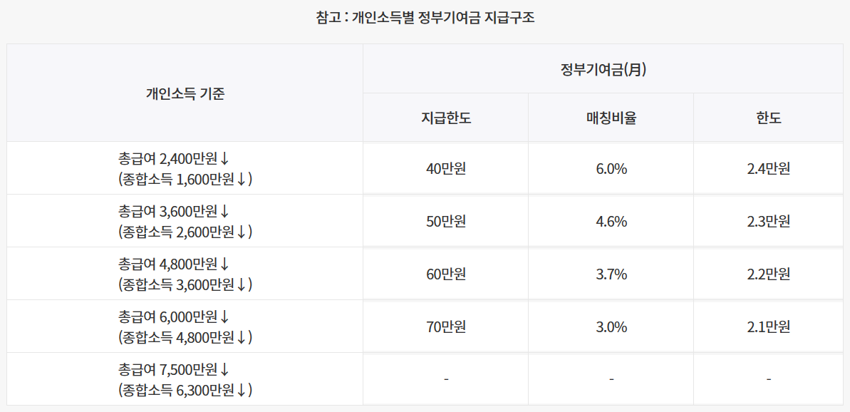 - 납입한 금액에 비례하여 소득구간별 정부 기여금 지원